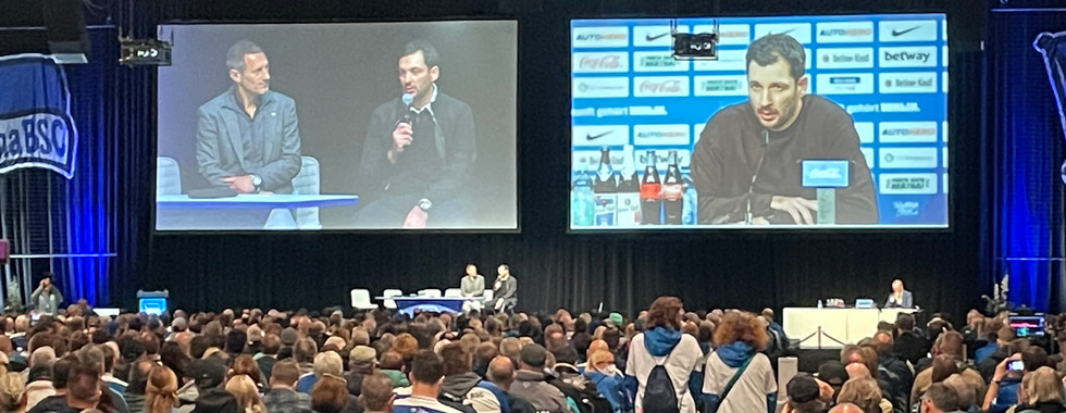 So die MV hat angefangen und alle lauschen gespannt den Worten unseres Präsidenten und danach den Worten von unserem Trainer Sandro Wagner. Herthinho gönnt sich währenddessen einen Kuchen.